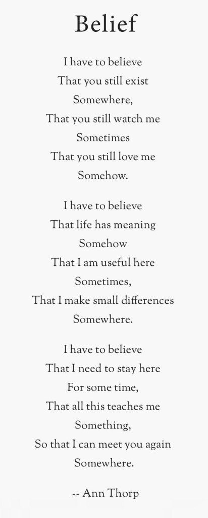 “The plea for closeness to our dead can always be heard-if we are still, if we listen. When we ignore that call for too long, we fragment. When we remember them, we bring the whole of their existence back into our hearts.”- From ‘Grieving Is Loving-Compassionate Words for Bearing the Unbearable’ by Dr. Joanne Cacciatore